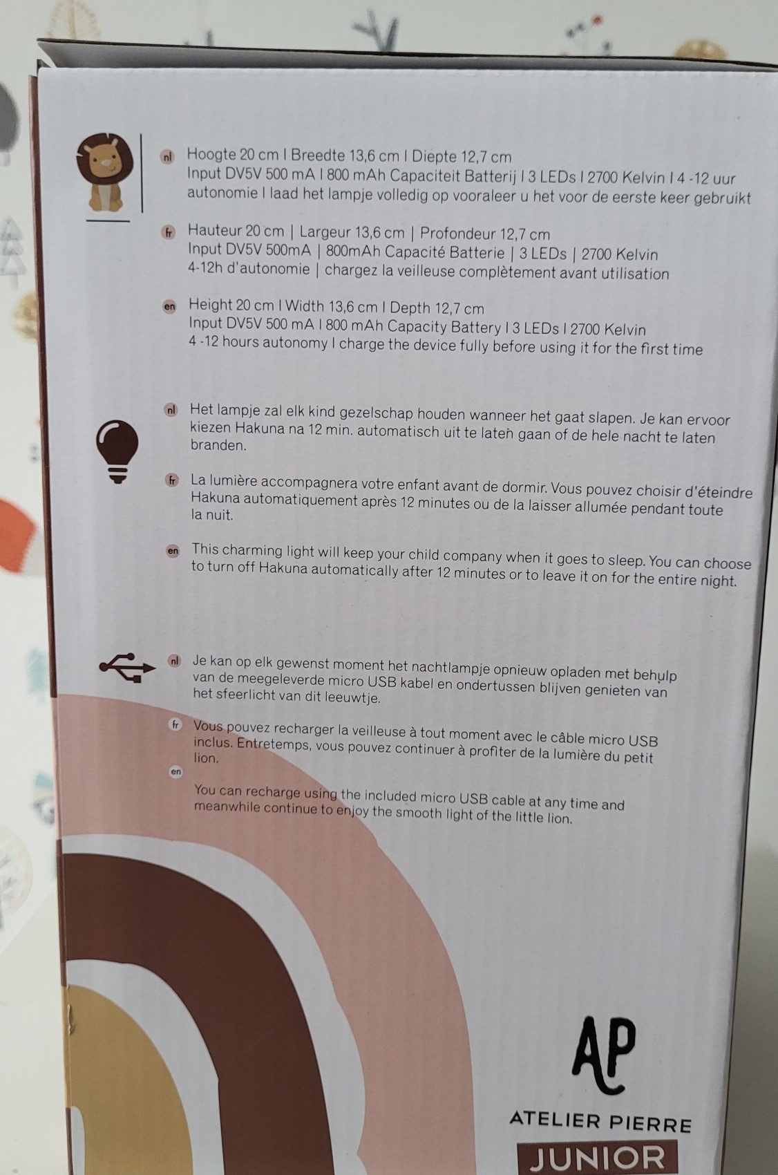 Tijdelijk in prijs verlaagd ! Met deze stoere, lieve koning van de jungle van het Belgische merk Atelier Pierre hoeft je kindje niet bang te zijn in een donkere slaapkamer. Het dimbare nachtlampje brengt een rustgevende sfeer in de slaapkamer. Het lampje in de vorm van een leeuw is bovendien ook een leuke decoratie op de kinderkamer.