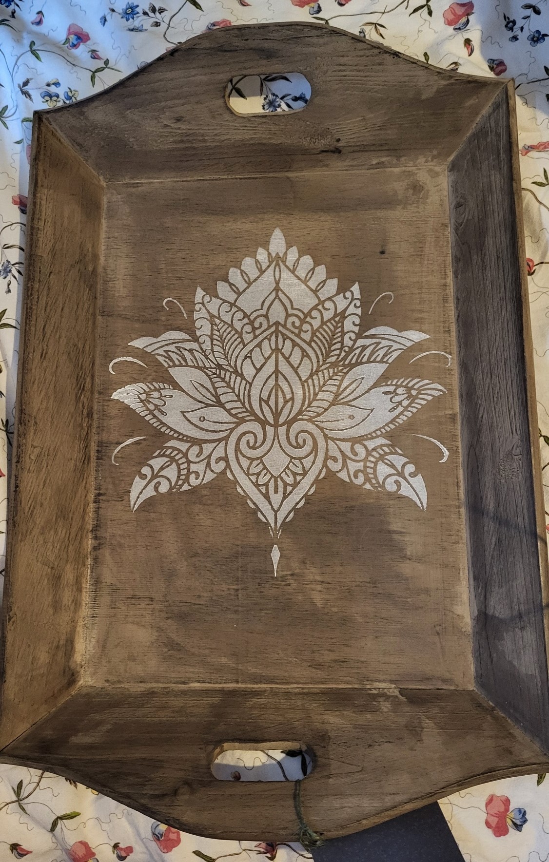Op zoek naar een uniek kadootje ? Gevonden ! Leuk, groot dienblad old brown bedrukt met een Mandala in witte acrylverf. De afmeting van het dienblad is : 56 x 37,5 cm.