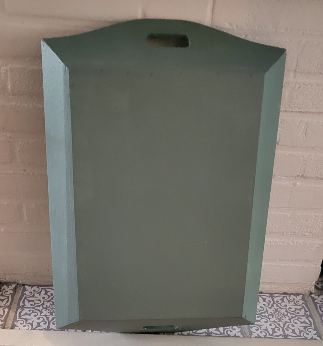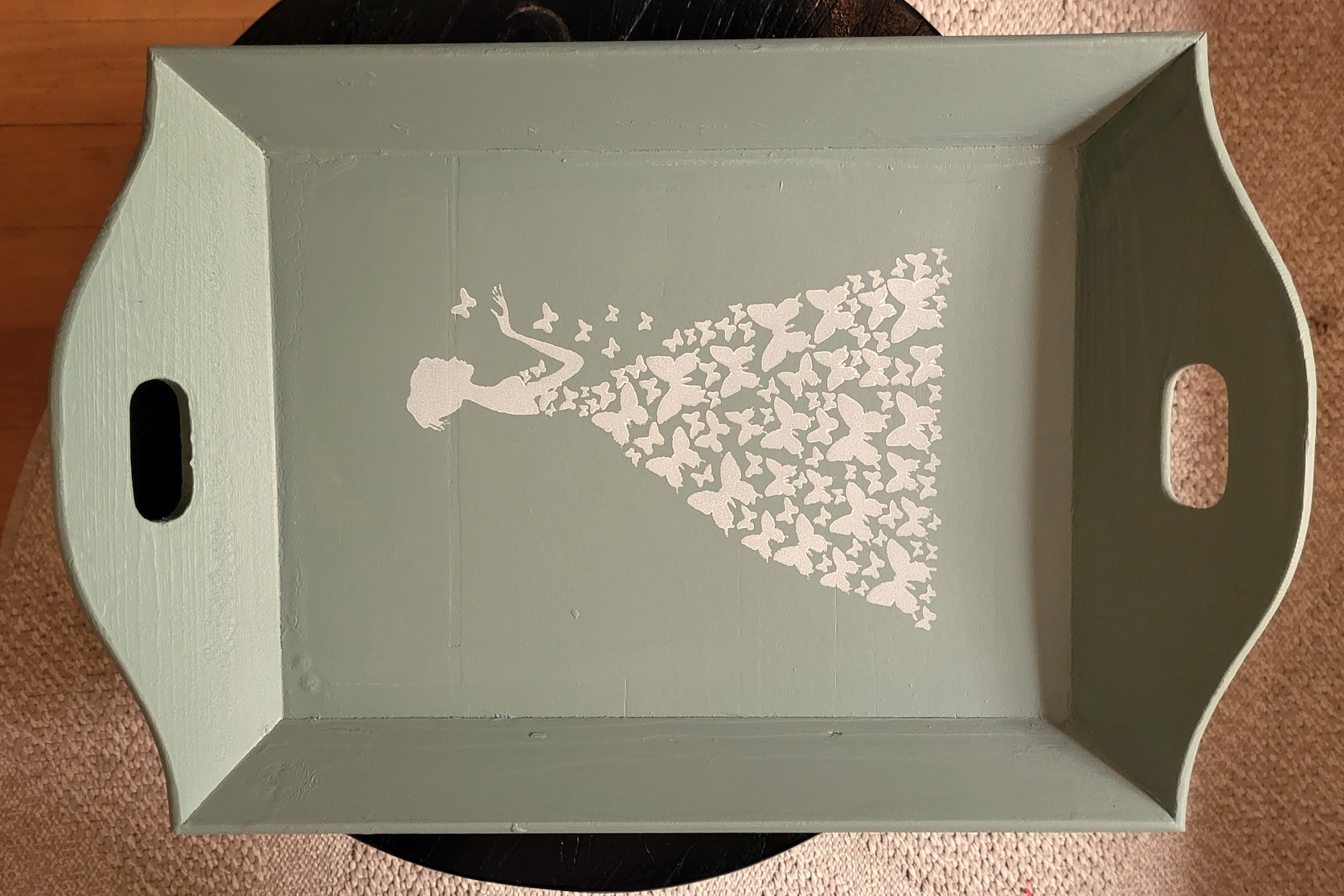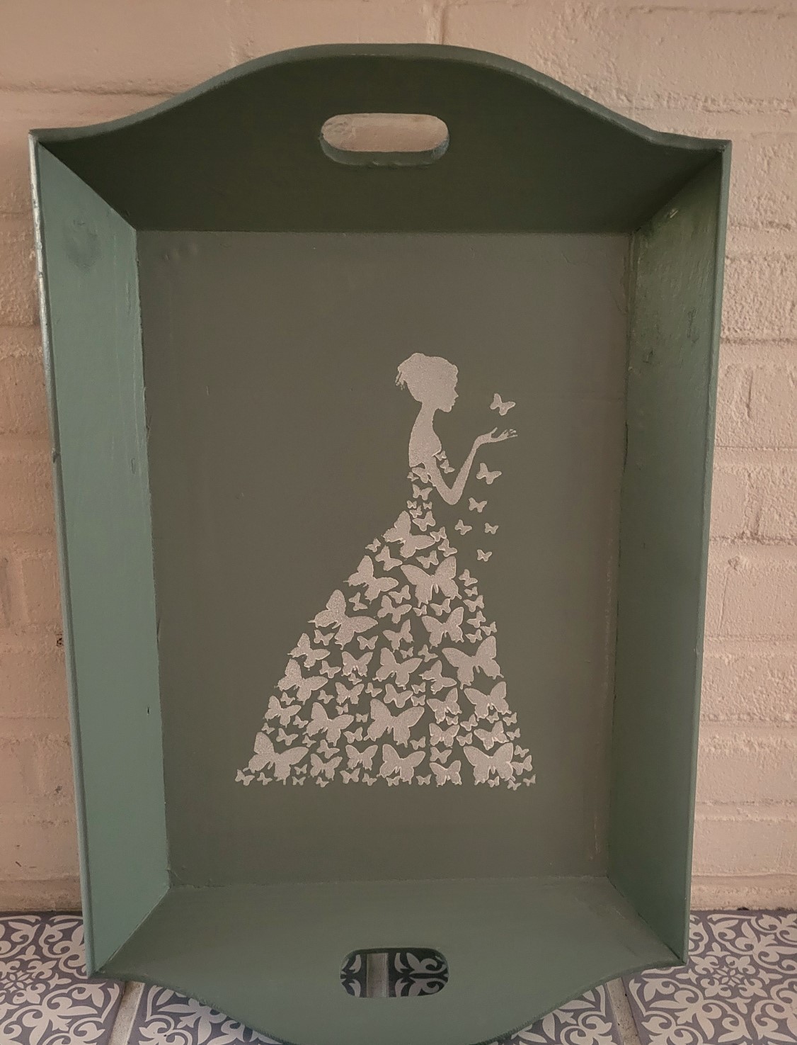 Leuk, groot dienblad geverfd in een matte kleur groen en bedrukt met een dame met vlinderjurk in witte acrylverf. Afgewerkt met een transparante lak. De afmeting van het dienblad is : 56 x 37,5 cm.